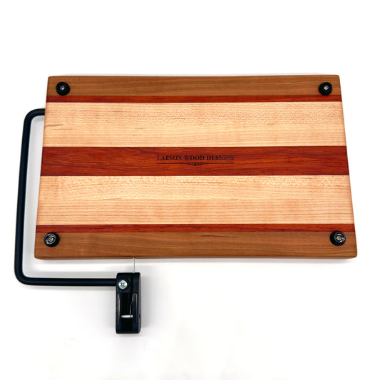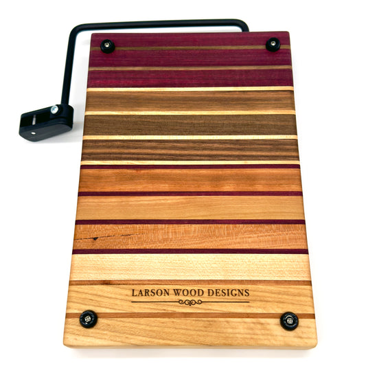 Larson Wood Designs’ Cheese Slicers combine the beauty of handcrafted hardwoods with the practicality of a precision slicing tool. Each slicer is meticulously crafted from premium woods, showcasing the natural colors and grain patterns—without the use of dyes—making each piece a unique work of art. Perfect for effortlessly slicing through your favorite cheeses, these boards are designed for both functionality and style. Finished with mineral oil and food-safe cutting board wax, they offer long-lasting durability and a smooth, polished surface. Equipped with a high-quality wire slicer and non-slip feet for stability, these cheese slicers make entertaining both elegant and easy. Ideal for daily use or special occasions, they bring a refined touch to any cheese presentation.