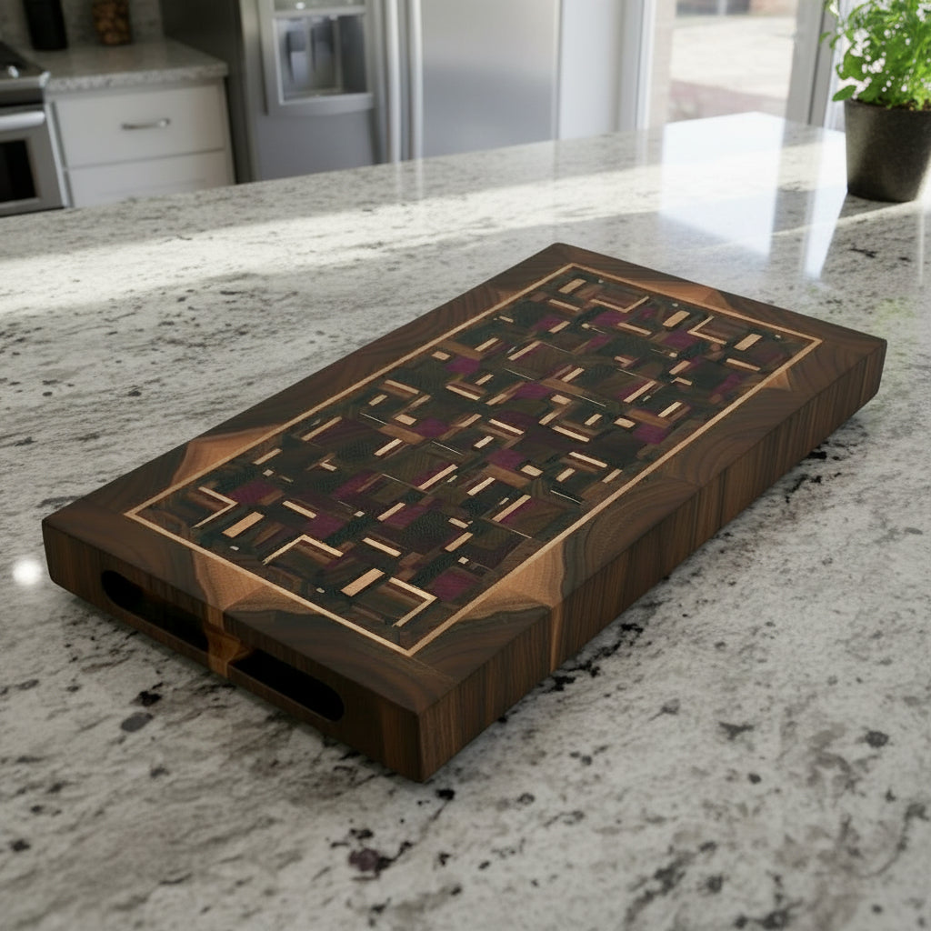 This exquisite end grain cutting board, Aster, showcases a mesmerizing, intricate pattern created from a stunning mix of hard maple, black walnut, padauk, purpleheart, cherry, and wenge. The natural colors of the wood are on full display—no dyes are used—allowing the inherent beauty of each species to shine through. Framed by three true end grain borders of black walnut and hard maple, the board offers a bold contrast that enhances the chaotic, yet captivating, pattern in the center. Engraved handles on both ends allow for easy maneuverability, while the one-inch brass non-slip, non-marring feet provide added stability and elevate the board, blending functionality with elegance. Treated with mineral oil and finished with our custom cutting board wax, Aster is designed to be both durable and stunning. Each board comes with a complimentary 4oz tin of Larson Wood Designs' Board Butter to help maintain its natural luster and longevity. Dimensions: 14.75"L x 8"W x 1.25"H.
